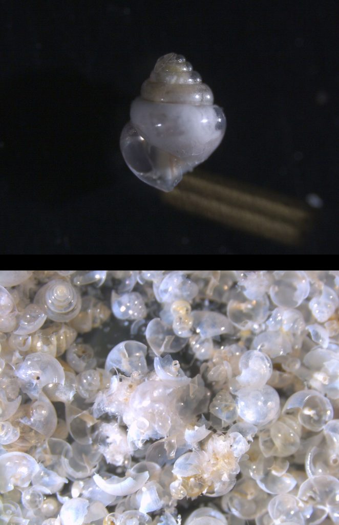 Calcifiers, including pteropods, use bicarbonate ions to form CaCO3 (Middelburg et al., 2020), removing bicarbonate ions and producing hydrogen ions and CO2 during this process. On short time scales, CaCO3 production decreases surrounding seawater alkalinity, with CaCO3 sinking and dissolution producing alkalinity (Middelburg et al., 2020). This has the ability to weaken the impact of the soft tissue pump (production of organic carbon) that removes CO2 through photosynthesis (Liang et al., 2023; Middelburg et al., 2020) and creates what is known as the term the carbonate counter pump. Pteropodas can also be some of the early indicators of ocean acidification due to their sensitivity to ocean pH, making them important to study in the context of climate change.